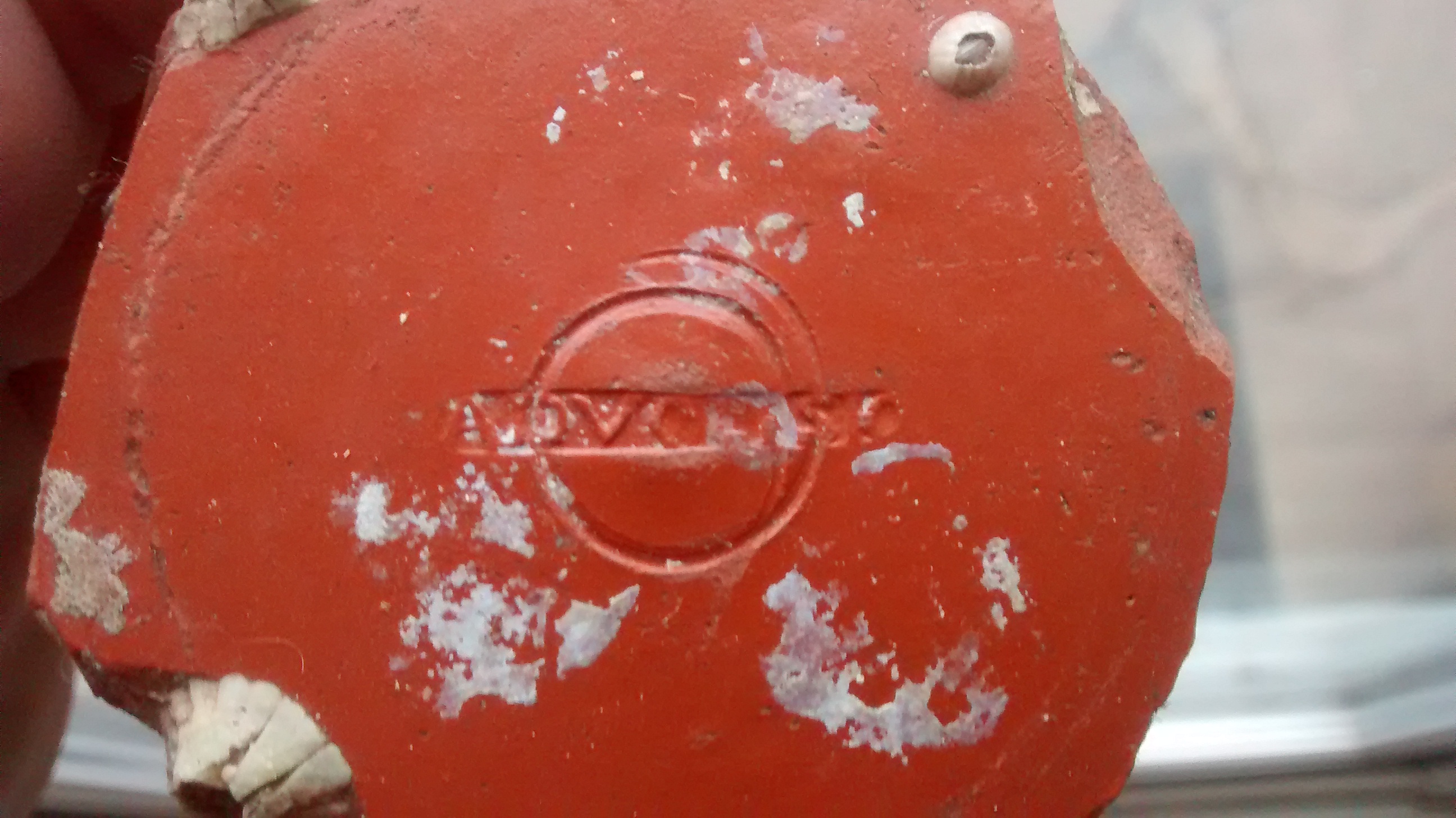 A sherd of the base of a samian vessel, form unknown. The easily legible name-stamp is that of Advocisus who worked at Lezoux (Central Gaul) c. AD 160 to AD 200.