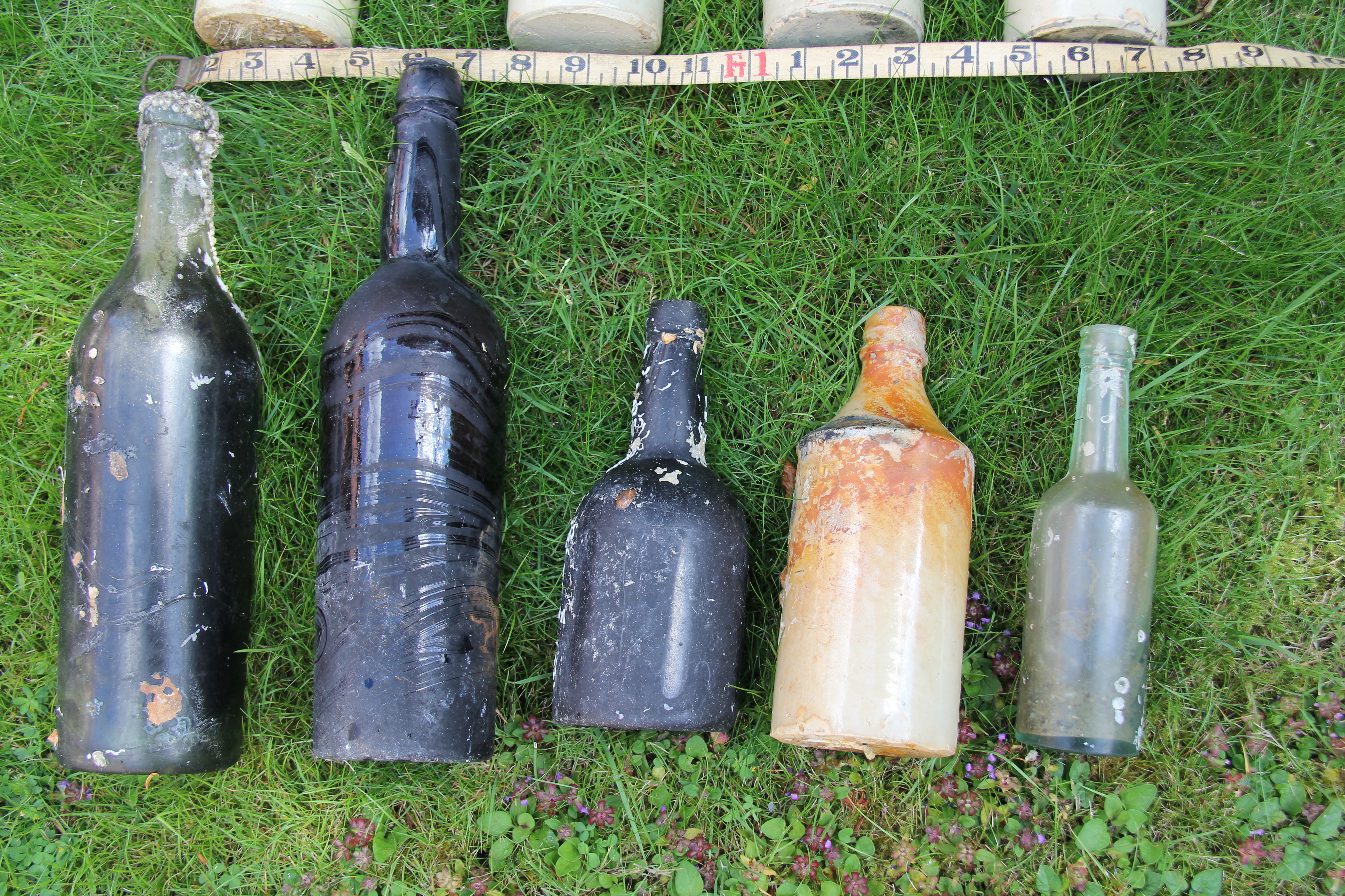 The two full-size glass bottles are thought to be either wine or beer bottles. If the bottles have kicked bases, it would indicate a wine bottle, while a flat base would indicate a beer bottle.