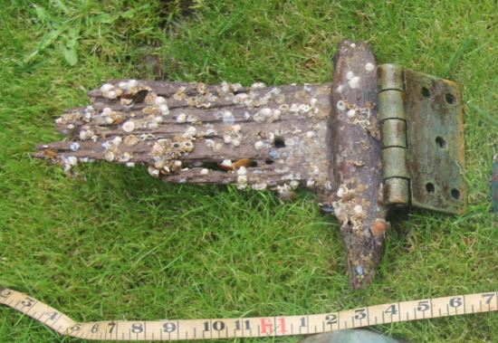 The wooden elements of the hinge are highly degraded and encrusted with barnacles, its function is therefore undiscernible. There does appear to be an element of beading or a baton in wood, immediately attached to the hinge leaf. Protruding from beneath the beading and running away from the hinge is a section of wood with apparently parallel edges, approximately 89 mm wide, that although heavily damaged may represent a narrow plank. This suggests that the moving element of the object, such as a door or hatch, was attached to the obscured leaf, with the other attached to the stationary element such as a door frame.