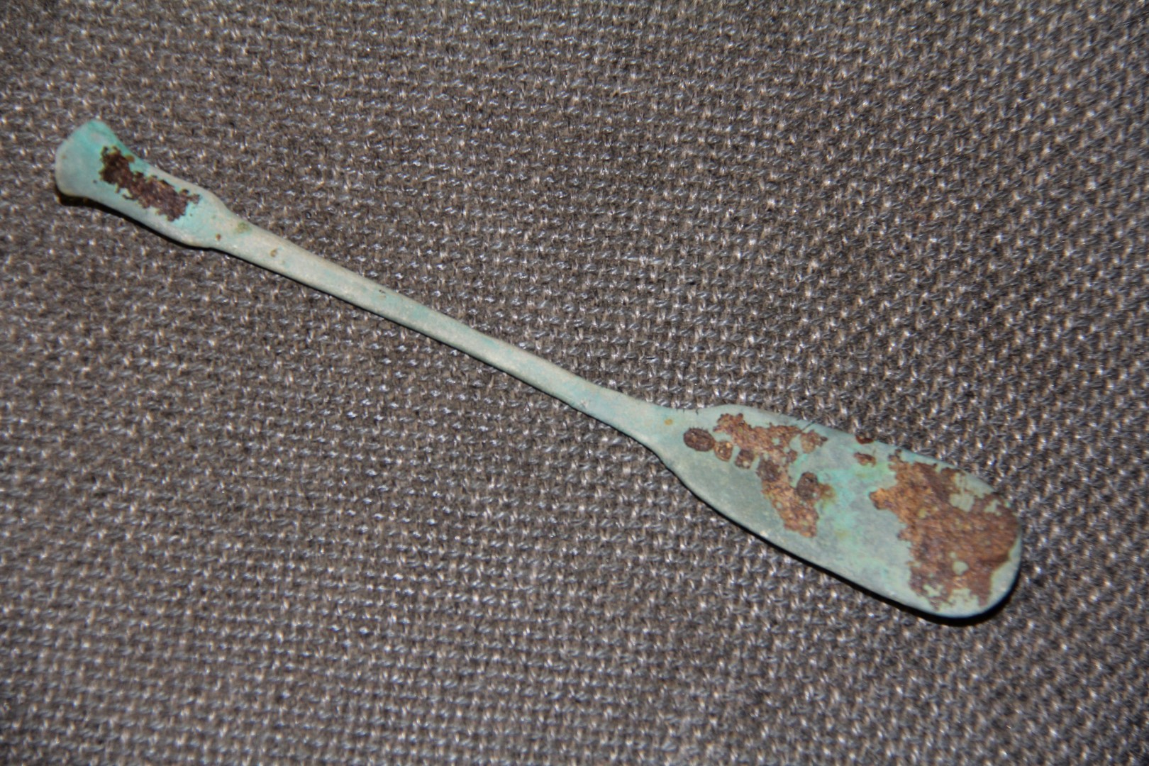 The set of four hallmarks located together on the piece of cutlery indicates it was made later than 1781, when this practice was first introduced. Based on this image, this type of spoon/fork is possibly a Fiddle pattern - this refers to the shape of the handle - and is a type introduced in the 1780s and still in production today. The Fiddle pattern means that there are shoulders on the stem near the bowl, which is seen on this example. The lower end of the stem juts out around 90 degrees but this example may have been worn down in the marine environment. Dominant throughout the nineteenth century, Fiddle pattern is the most commonly found pattern from the 1800s. Originating in France, it first occurred in England from the 1760s without the shoulders on the stem near the bowl. The most common Fiddle pattern variants are Fiddle & Thread and Fiddle, Thread & Shell. The production of plain Fiddle pattern ceased around the time of World War One (https://www.antiquesilverspoons.co.uk/spoon-info accessed January 2018).