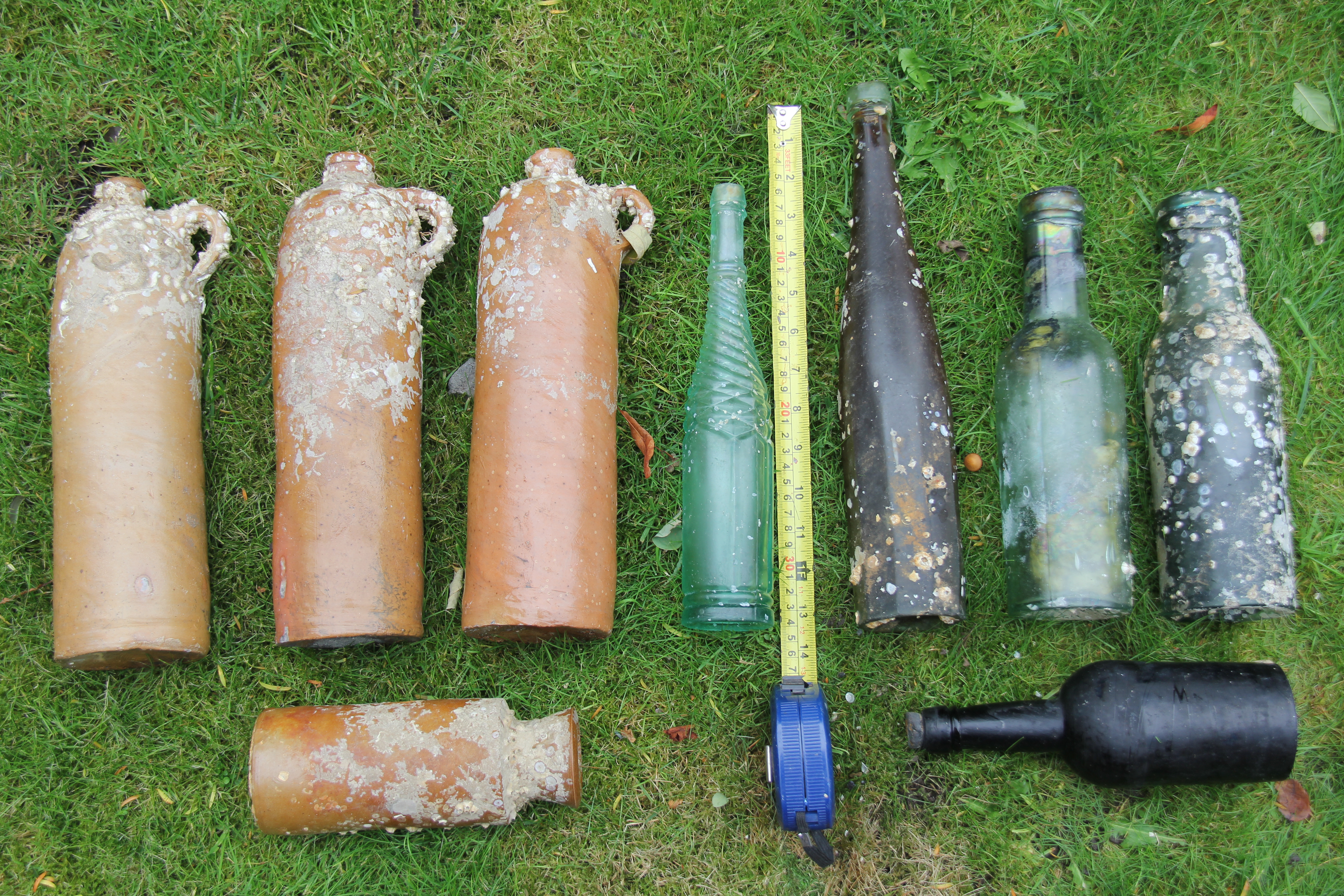 These items were found with one stoneware salt glazed jar (MAS-D100132), two clear glass fruit bottles, one ornate green glass wine bottle, one black glass bottle, one tall brown wine bottle with a hexagonal base (MAS-D100133) and part of a metal fork/spoon (MAS-D100134).