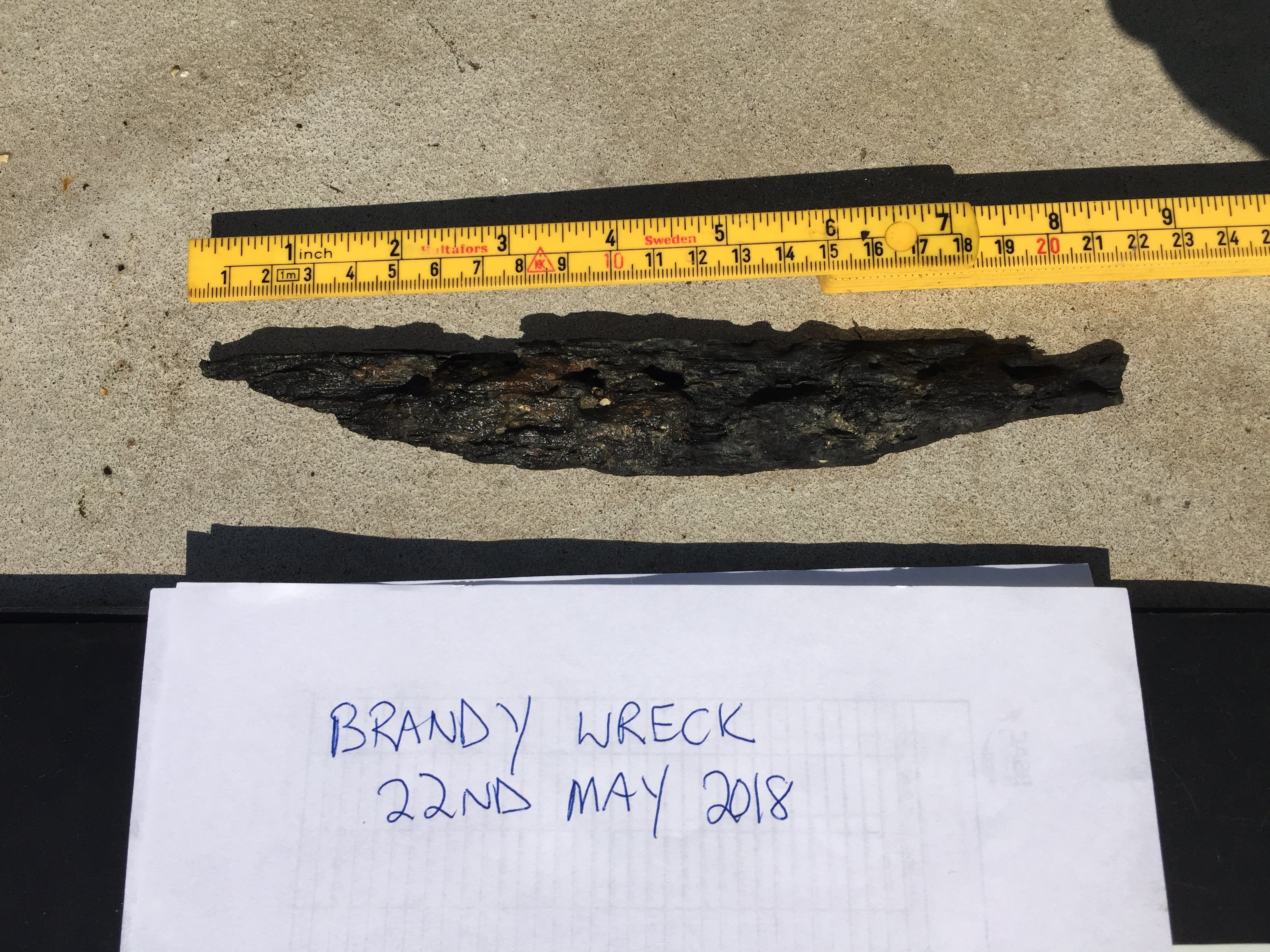 This find comes from an unidentified wreck known as the Brandy Wreck, situated east of Portland Harbour in Weymouth Bay, Dorset. An investigation of the newly discovered wreck was carried out by Wessex Archaeology (2016) in conjunction with The Shipwreck Project, a local organisation who discovered the site, and at the behest of Historic England. The lack of datable evidence from secure contexts, structural elements of a vessel and other factors meant that a precise date or name of the vessel could not be determined. Broadly, the vessel is thought to date between 1600 and 1825 AD and may relate to a naval or merchant vessel, or potentially be a chance accumulation of artefacts. Vessel currently has no NRHE or HER designation numbers.