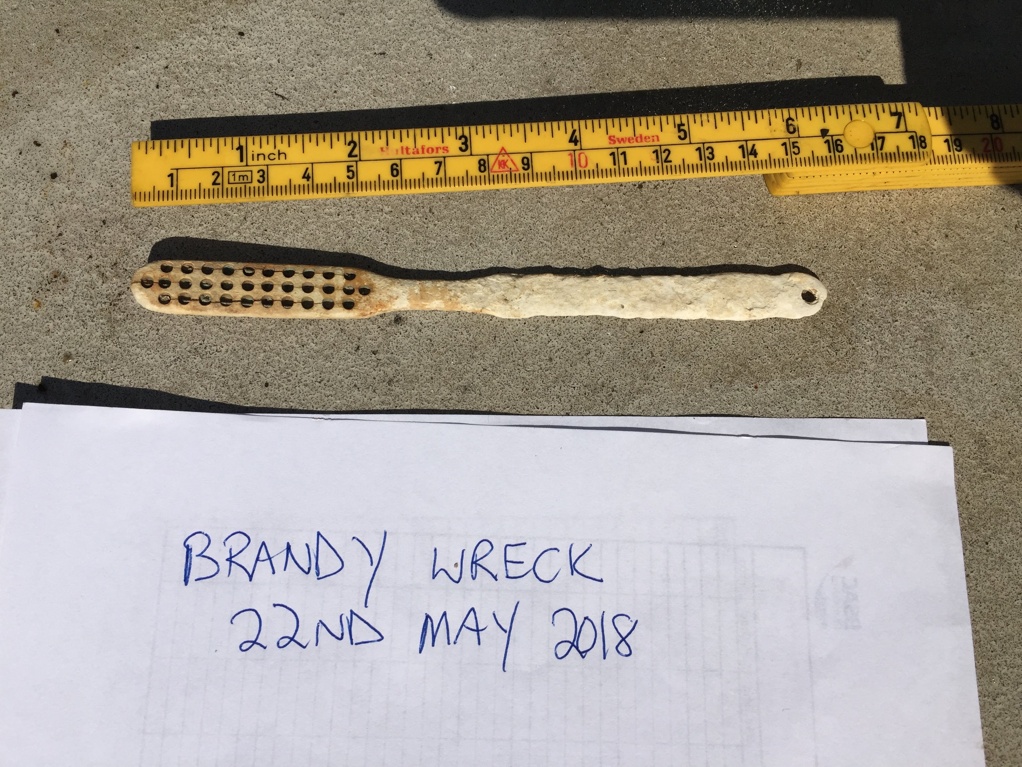 This find consists of a brush handle and head manufactured from either bone, horn or ivory, with the bristles missing. The item is approximately 160 mm in overall length, with the head being c. 60 mm, a neck of c. 20 mm and a handle of 80 mm. The head of the brush is c. 15 mm wide, the neck c. 8mm and the handle c.10 mm. There is a small hole in the end of the handle, presumably for accomodating a lanyard or for hanging the brush from. In the head there are 32 holes for accomodating the bristles, with channels recessed and filled on the rear face where the bristles would have been secured. The condition of the brush is poor, especially the handle where the bone is heavily degraded. No markings are evident anywhere on the object. The brush is of a type used for cleaning teeth from the 17th through to early 20th century, closer dating is not possible without markings or further typological detail (https://www.dentalartsmv.com/the-long-and-remarkable-history-of-the-toothbrush/ accessed March 2020).