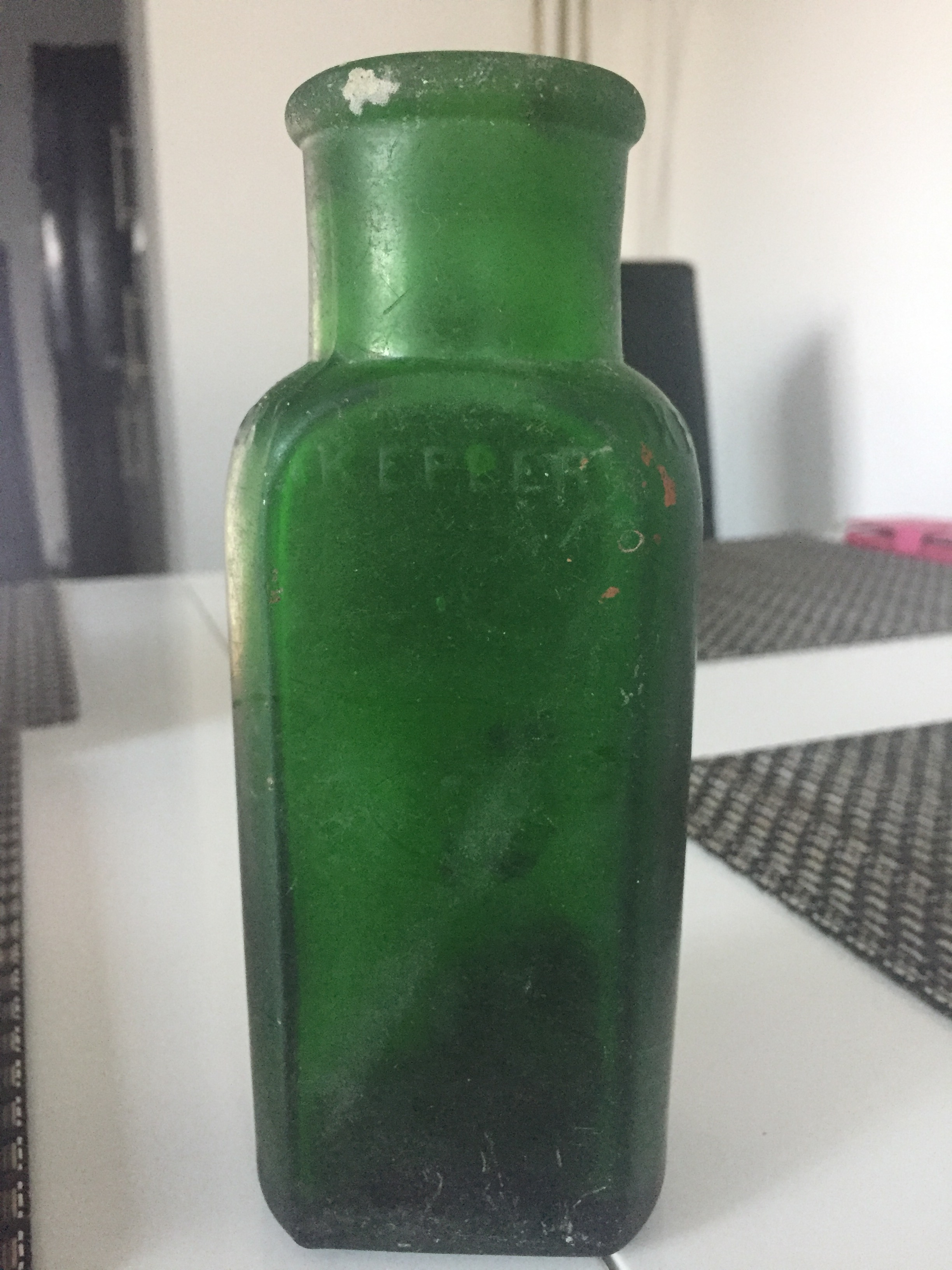 This find is a small medicine style bottle in green glass. No scale was provided but these vessels are usually 160 - 190 mm in overall height. The vessel is flat bottomed with a rectangular shape in plan, with the short sides being rounded. it has a short but wide neck ending in a bead type finish, common to medicine bottles. Embossed on the shoulders of the vessel is the word KEPLER, which refers to the product which it contained. The base is embossed with SNOW HILL, B. W. & Co, LONDON, which refers to the manufacturer and their factory in London. The condition of the vessel is good though the cap or stopper is missing along with a paper label that was common to these vessels.