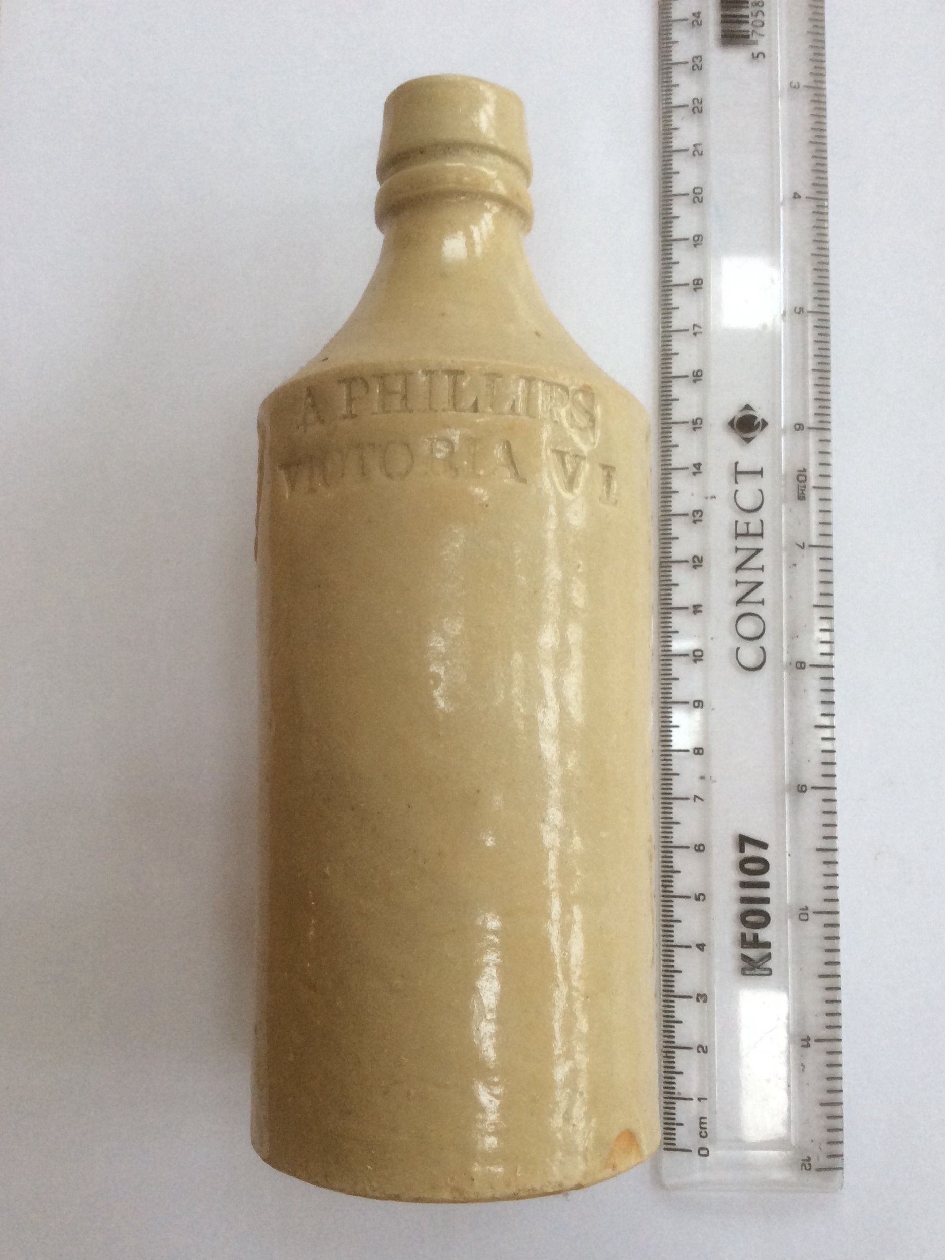 The A PHILLIPS inscriptions refer to the Pioneer Syrup, Soda & Cider Works established by Alexander Aaron Phillips of Victoria, British Columbia after 1858. Mr Phillips is the first recorded Jewish resident of Victoria (http://www.jmaw.org/phillips-victoria-jewish-bc/ accessed January 2019). The vessels presumably predate the 1881 change of the business name to A Phillips and Son. No record of where these vessels were produced could be found, though given the large quantities of stoneware vessels exported to Canada and the USA from Great Britain in the mid-19th century it is possible these were being exported to Canada for Mr Phillips.
