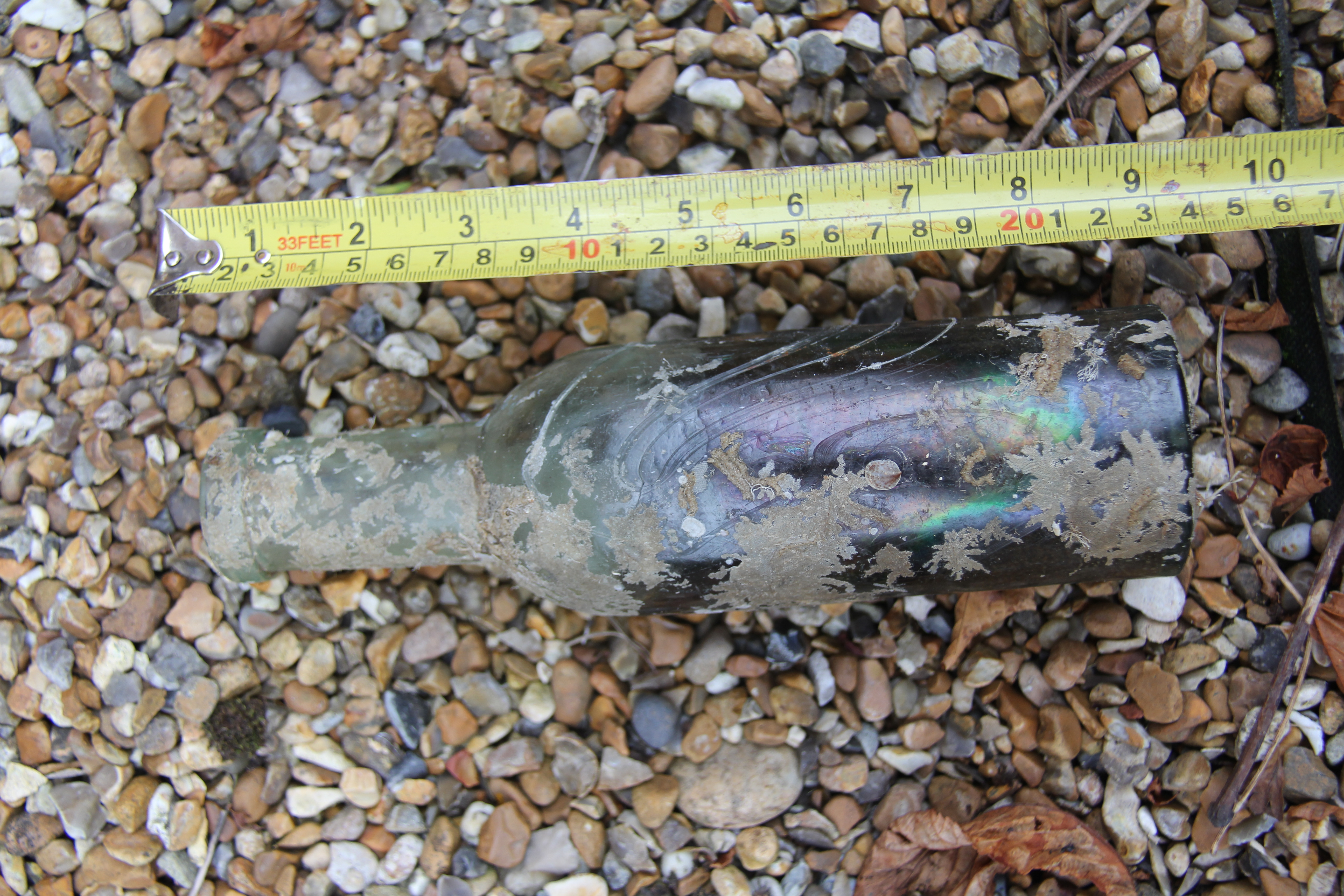 Bordeaux style bottle manufactured in clear aquamarine coloured glass, though weathering has caused the colours to distort and becom pearlescent towards the base of the vessel. It has a wide and straight neck and is finished in the applied ring or champagne style. The body is cylindrical, with low profile rounded shoulders. The height of the bottle is approximately 230 mm, the diameter of the body 60 mm and the neck 30 mm. Though this bottle is smaller than the more common 300 mm tall, 750 ml wine bottles it is most likely a wine bottle. It's clear colour suggests a dessert or sweet wine, at the very least a vessel for white rather than red wine.