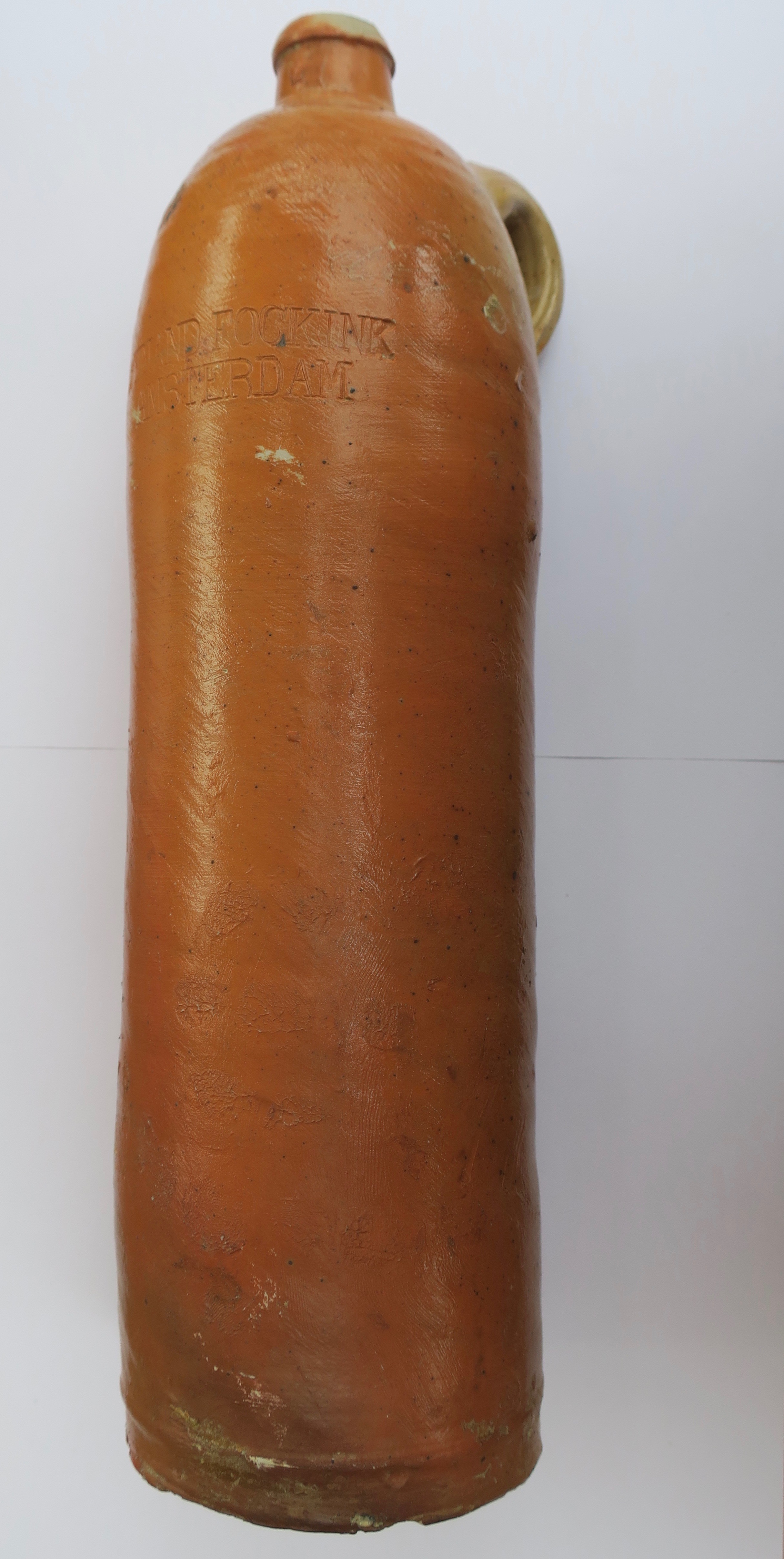Brown ceramic bottle with a glazed surface. It was intended to contain gin of Dutch origin. The bottle measures 310 mm long and has a diameter of 85 mm with a ring type handle on the neck of the bottle. The bottle is printed with the phrase 'WYNAND FOCKINK' 'AMSTERDAM'.