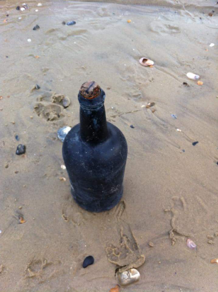 A bottle made from dark green/black glass, bearing a protruding cork. It has a slightly concave body, flaring moderately at the base, leading to gently rounded shoulders with clear definition where they intersect with the neck. The neck itself is broadly straight, tapering slightly where it meets the finish. The finish is of either a double oil or brandy type. The bottle is reminiscent of a spirit bottle of the squat cylinder style, though vessels of this style were used to contain a variety of products beyond beers, wines and spirits. Bottles of this type were manufactured from at least the 1730's until the late 19th century, examples of both free blown and moulded vessels are known. This bottle is likely to have been hand blown in a mould, it bears a slight lean from the base but otherwise appears uniform.