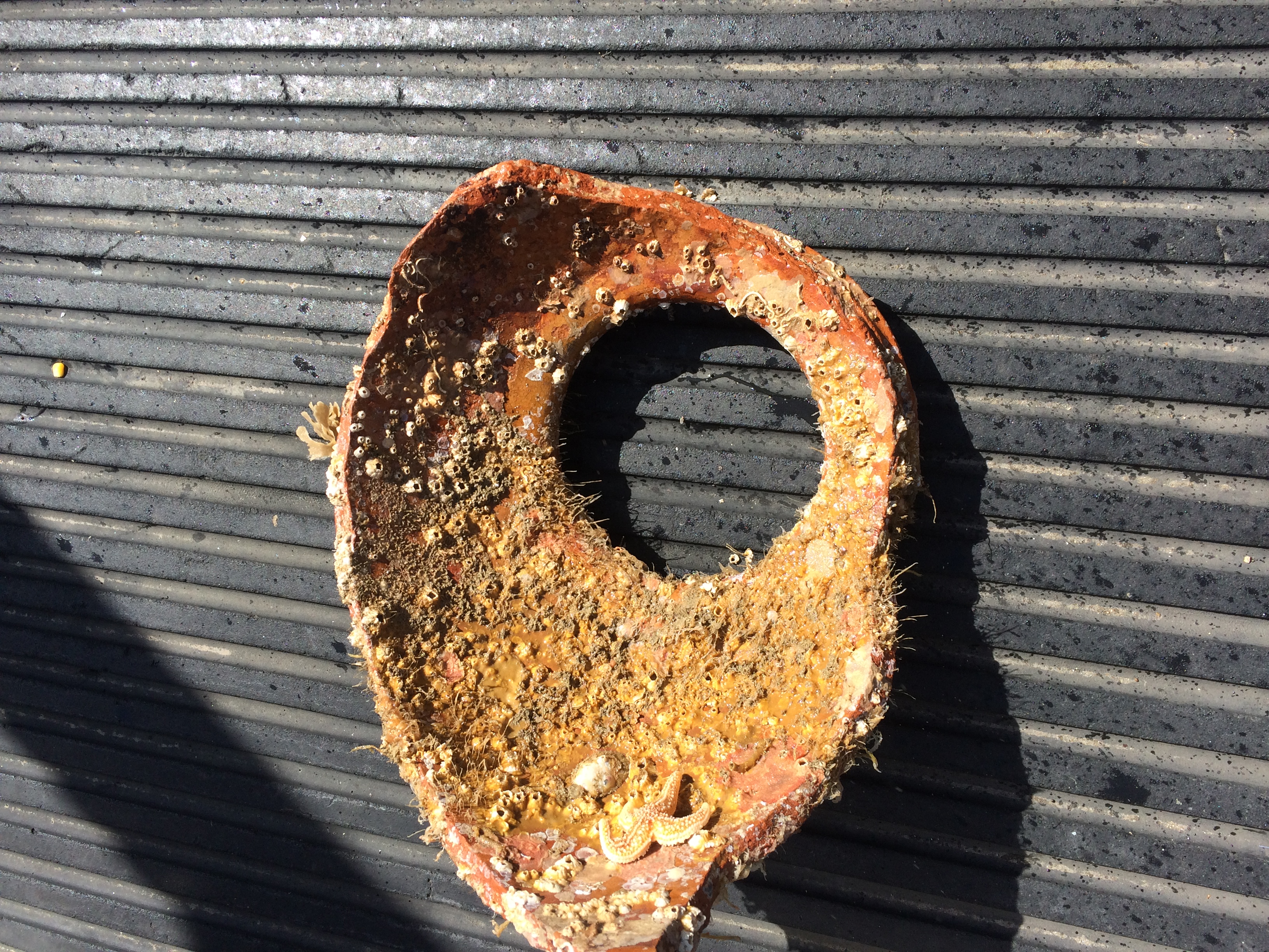 Part of a large clay storage jar. Due to the size of the fragment and the degree of marine growth on this item it has been tentatively identified as an olive jar, probably Spanish in origin, and dating anywhere between the medieval to post-medieval period (13th/14th to 18th century), most likely from the latter end of this date range (16th - 18th century).