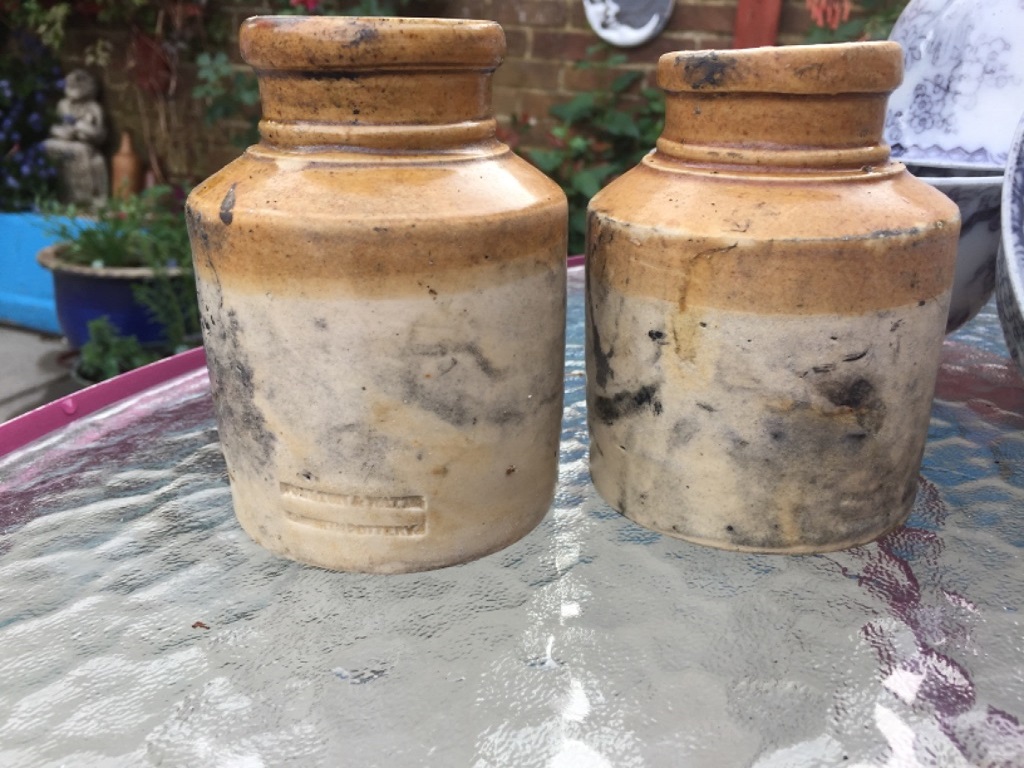 Two stoneware jars with feldspathic glaze over yellow ochre dip on upper part of vessels. One carries the stamped mark of the manufacturer: 'Doulton & Watts' Lambeth Pottery'. The firm of Doulton and Watts was established in 1820 as Watts and Doulton, becoming Doulton and Watts by 1826 (Tyler et al. 2005, 12). This particular stamp was used until 1858, when John Watts died, after which the name Doulton appeared alone (Eyles and Irvine 2002, Appendix II), although the company name of Doulton and Watts was used in trade catalogues until at least 1873. Feldspathic glazes were introduced in the 1830s.