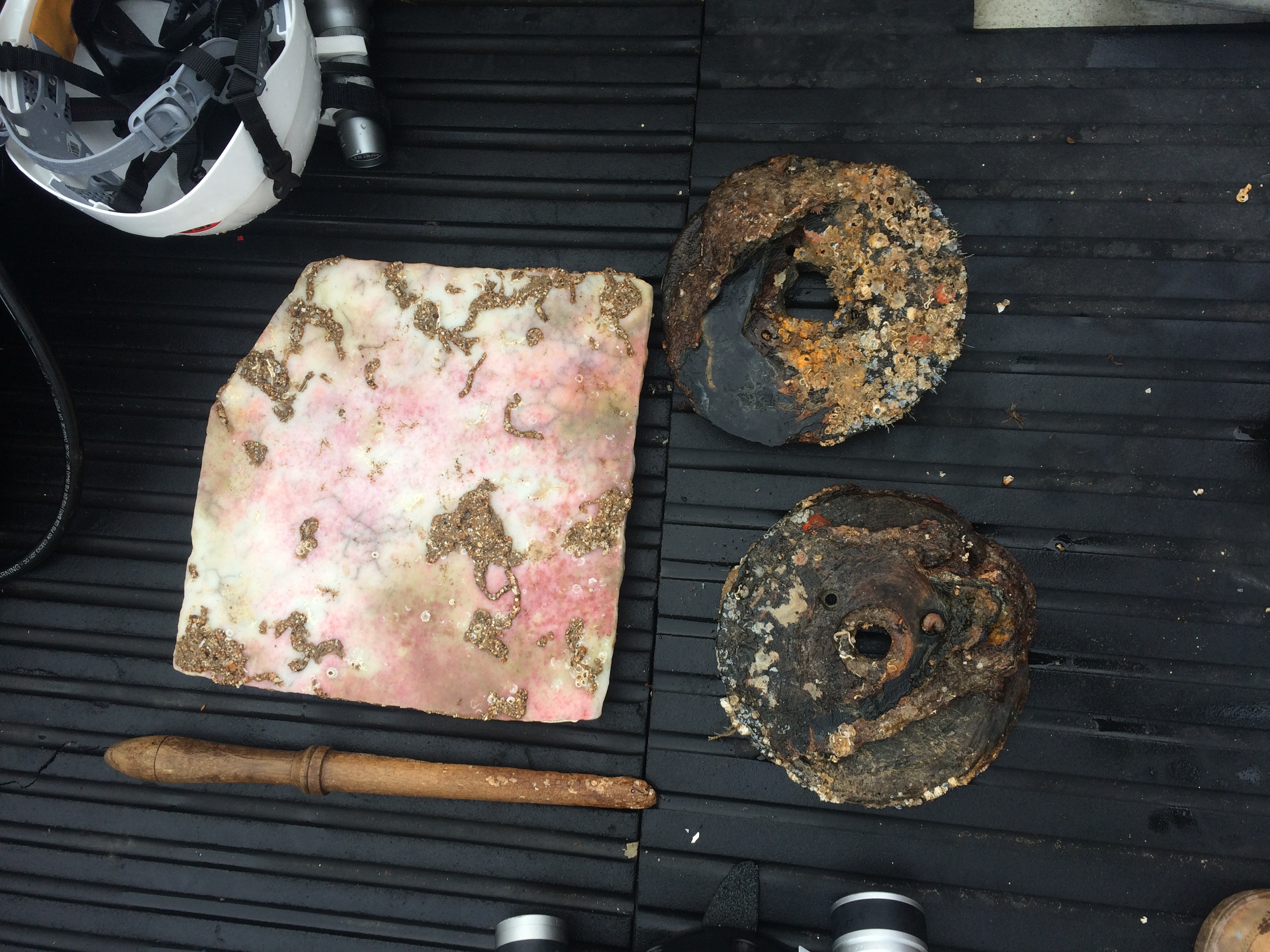 This item was found along with a wooden belaying pin (MAS-D100032) and two pulley sheeves (MAS-D100049).