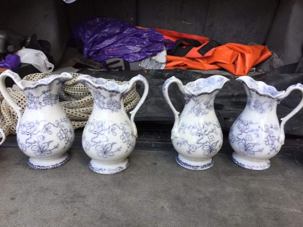 Four milk jugs with a Chinese style design and a light grey coloured pattern and appear to be made of porcelain (although this has not been confirmed). Similar in decorative style to the bowls recorded as MAS-D100047, it is assumed that the these milk jugs were made by either Charles Meigh of Hanley, Staffordshire (1835-49), the preceding company, J. Meigh and Son (c.1805-34), or the succeeding company, Charles Meigh and Son (1851-61) (Godden 1964, 428-429).