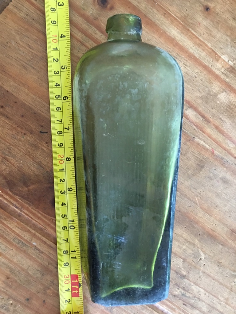 Some of the earliest spirit bottles were square in cross section and generally designed to contain gin, though undoubtedly contained various types of alcohol and possibly wine. Commonly called "case gin" or "taper gin" bottles since they would pack more efficiently to a case (six to 24 bottles) than round bottles. Case gin bottles are square with a more or less distinct taper inwards from the shoulder to the base. The neck is very short to almost non-existent with the finishes varying from a laid-on ring, flared, mineral finish, oil, and even a blob. This shape and style of bottle originated, and was commonly made, in Europe at least as early as the mid-17th century (https://sha.org/bottle/liquor.htm#CaseGinbottles accessed October 2017). These examples do not exhibit the bevelled corners generally seen on bottles of the 1860s or later and may therefore be earlier 19th century.