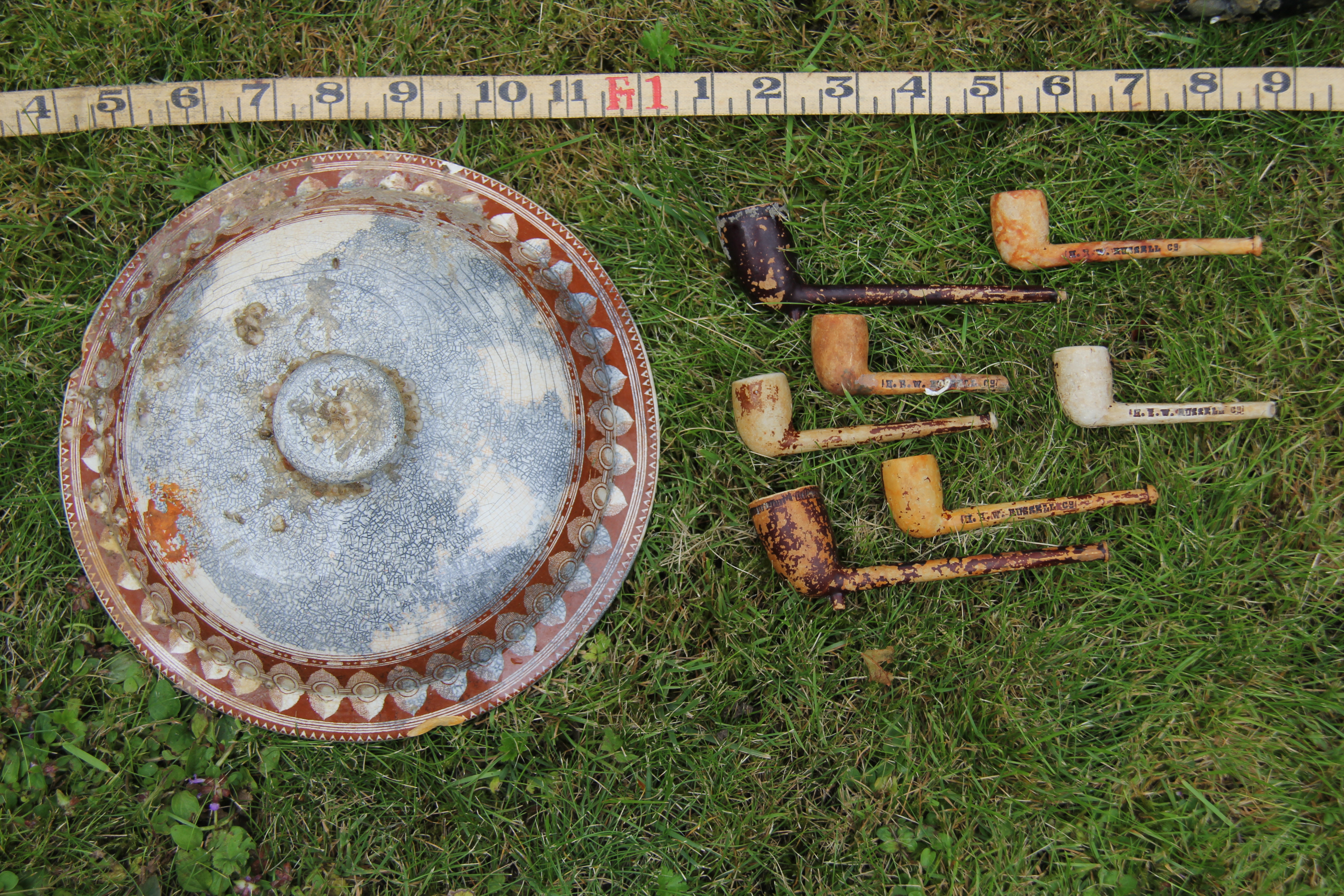 Two of the pipes are of 'Irish' type (Atkinson and Oswald 1969, type 31, dated post-1840), with spurs and milled bowl rims, and the remaining five are of a spur-less form copying the briar pipe (ibid., type 30, dated c. 1850-1910). All of the clay pipes are 'cutty' (short) pipes. The spur-less examples are all stamped with the mark 'H B W Russell Co.'. This appears to be the mark of an agent or retailer rather than the pipe manufacturer (as is more usual). H. B. W. Russell may have a connection with Liverpool - pipes stamped 'HBW Russell of Liverpool' have been found in Ghana (Basford 2012), but the company also had a base in Cape Town (Micots 2010).